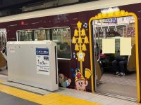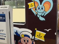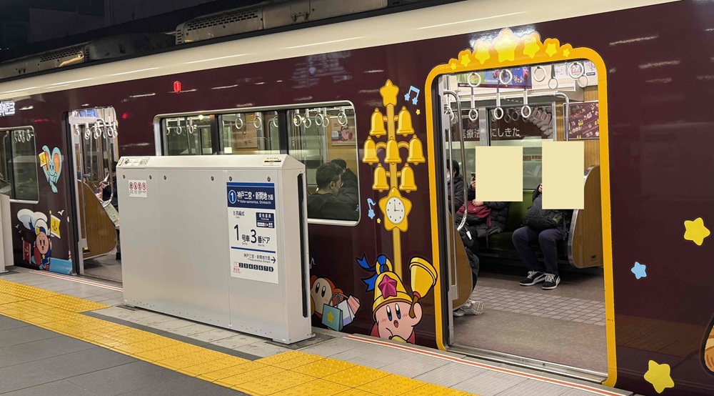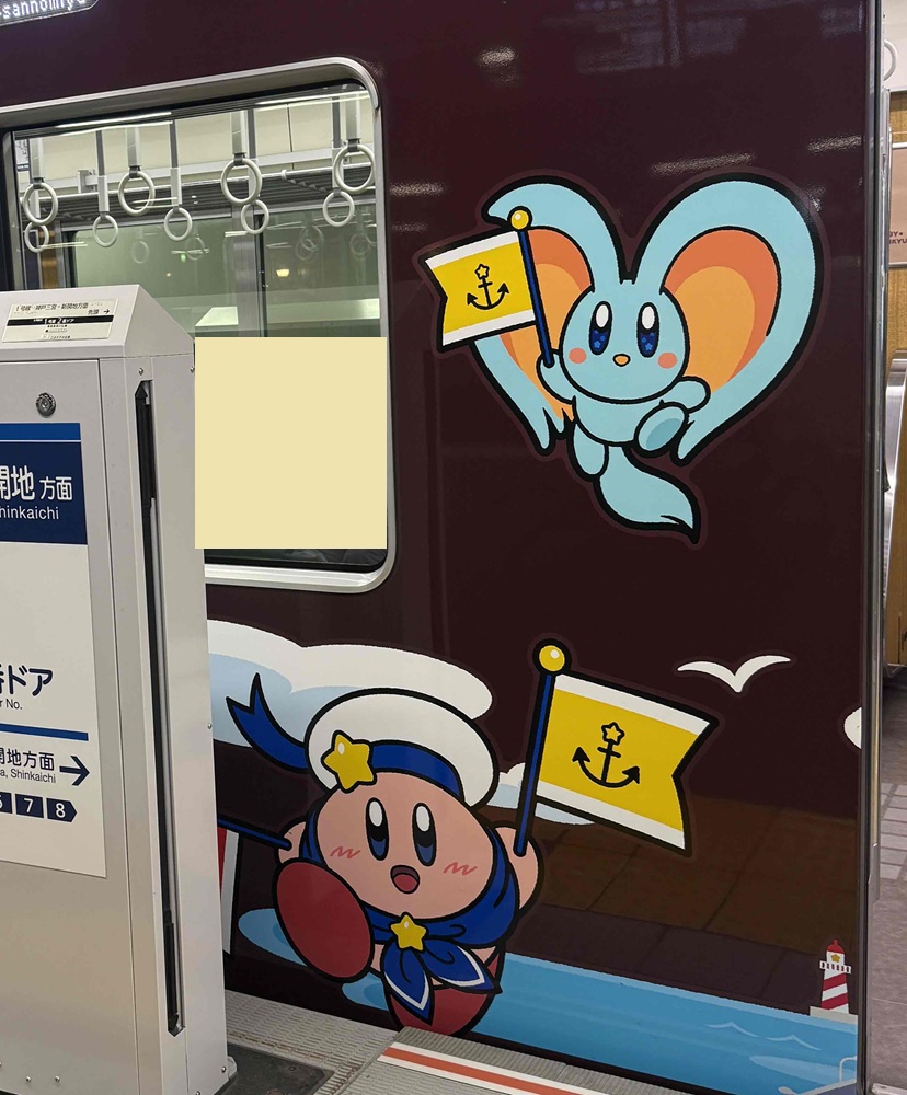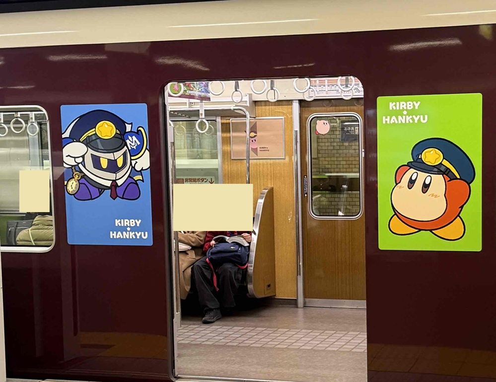 阪急電車の2枚目に、ドアのガラスや広告にも カービーがいますよ。