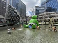 お店横のうめきた広場水景に 大相撲三月場所を応援する緑のくまさん「テッド・イベール」が鎮座