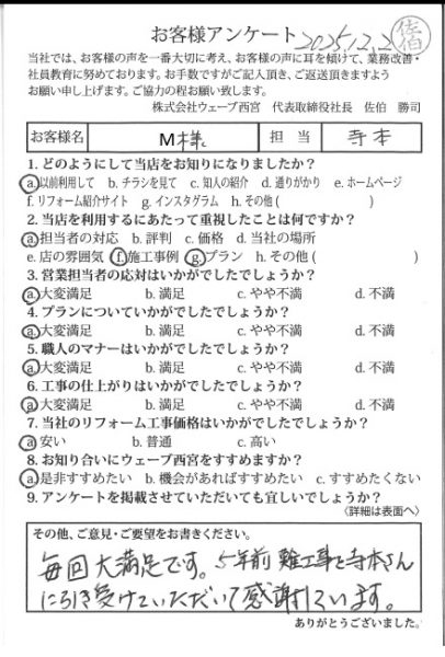 毎回大満足です。5年前に難工事を寺本さんに引き受けていただいて感謝しています。